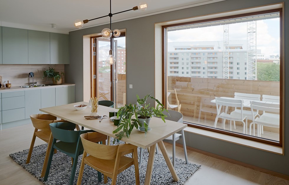 Strandparken’s location on the sunny side of Bällstaviken marked the starting point for the design. Contact with the water, sightlines, the sun, the surrounding area and the mature trees helped to determine the position of the buildings. The steeply pitched roofs of the apartment blocks have discrete eaves. The material count is low and the attention to detail is high. The structural frame is solid wood, with wooden façades that give the buildings a time-honoured and characterful appearance. Balconies with glass ends overlooking the water provide both views and privacy. Large areas of glass, with sliding doors onto the balcony or roof terrace, extend the apartments and give them a sunny outdoor space that offers contact with the water.