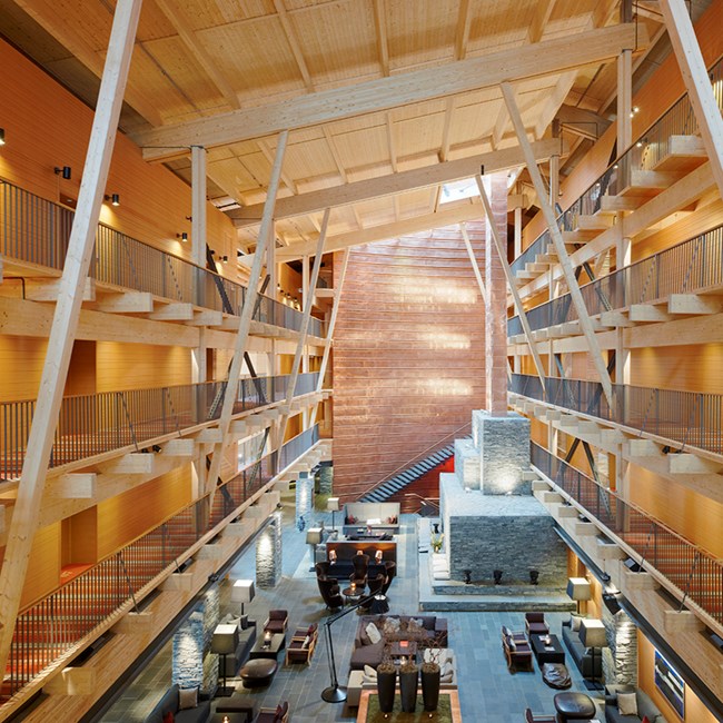 Located high up on a hillside, Copperhill Mountain Lodge is a ski hotel with views that go on and on. The large building’s glulam structural frame has been kept exposed indoors to create a warm and inviting atmosphere.