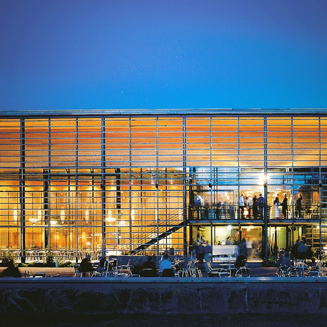 This building, created as a palace of entertainment and festivities, sits in Kungsparken in central Gothenburg, Sweden's second largest city. The building, nominated for the Swedish Wood Award in 2000, makes harmonious use of both concrete and wood.