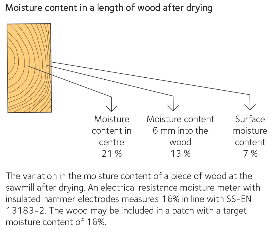 The scale of the moisture gradient is governed by the properties of the wood and the drying process. Immediately after the wood has been dried down to an average moisture content of 16%, for example, the surface of the wood is very dry, often with a moisture content of less than 10%. At the same time, the moisture content in the centre of the wood may still be above 20%. The moisture gradient will gradually even out after drying through diffusion, but the process can take a long time, particularly in low temperatures. The surfaces of the wood can be moistened from the outside if the wood is stickered and stored outdoors, resulting in less of a gradient.