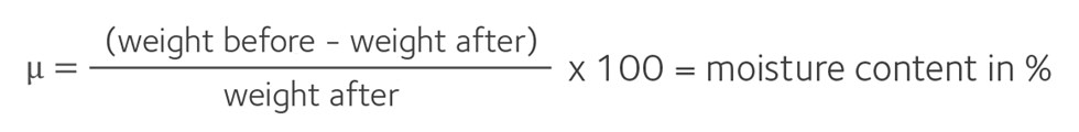 The moisture (water) content of wood is measured as the relationship between the moisture content in kg and the amount of dry material in kg. The moisture content, u, is specifically defined as the ratio between the weight of the water in the wet material and the weight of dried wood after drying at 103°C.