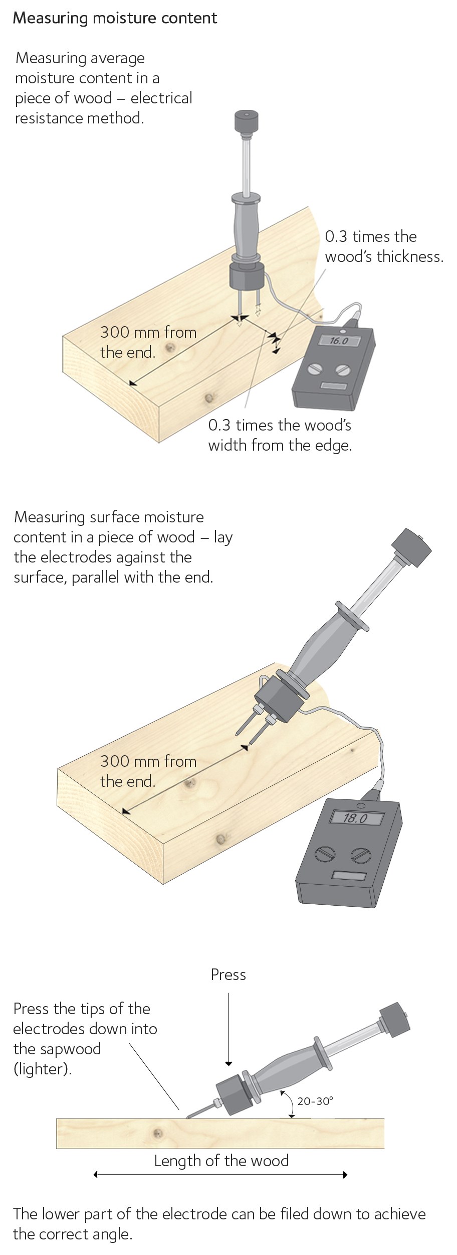 Only the very tips of the insulated hammer electrodes on an electrical resistance moisture meter have electrical contact with the wood. This makes it easy to determine the moisture gradient in the wood by first using the probes to measure the moisture content of the surface wood and then inserting them to a depth of 0.3 times the thickness. The difference in the values gives a measure of the total moisture gradient.