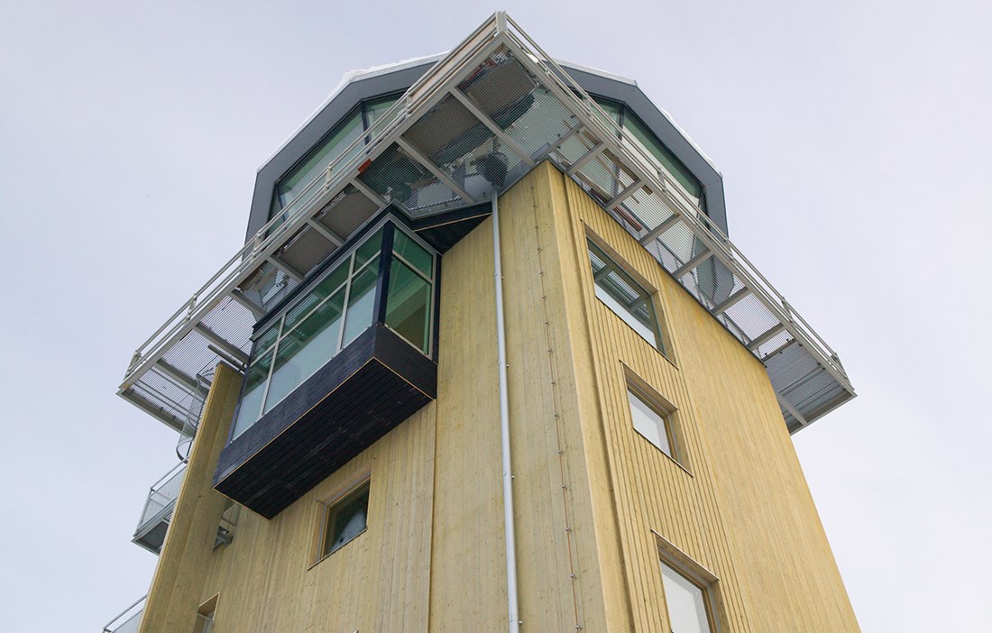 The six-storey control tower is just over 20 metres tall. The tower is made entirely in wood, with floor structures and walls in solid wood. The façade is finished in 300 mm wide glulam cladding with no horizontal joins, treated with an iron sulphate solution.