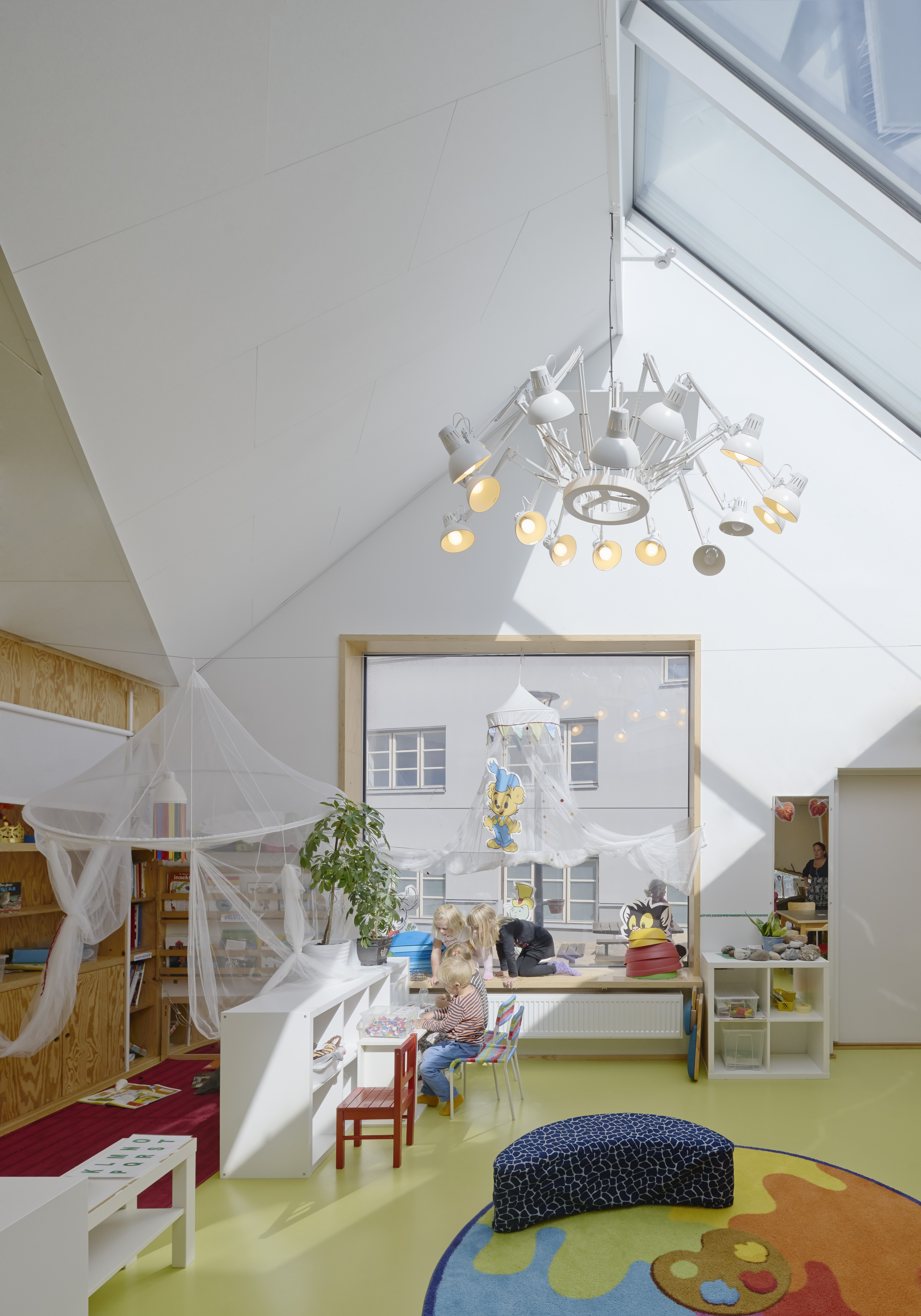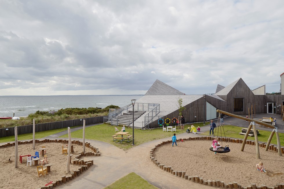 Råå Preschool is a great example of high ambitions from the client and the architect, with regard to designing an inspiring environment and scale on the children’s terms, interpreting the conditions of the site and exploiting the possibilities of wood to create playful and innovative forms and expressions. The jury particularly values the high level of ambition applied to a municipal building for children. This is a category of building that isn’t always afforded the greatest care and ambition. The building’s volume shapes the interior rooms into new worlds to explore and provides views of the sea and land, while the outer form creates its own landscape and makes a very singular and congenial addition to the existing buildings in this fishing community. The clever use of materials and attention to detail offer a new way of protecting against the elements while creating a richly realised interior that meets functional needs and invites interaction and experiences. Råå Preschool makes a convincing statement about the importance of space for children and young people.”