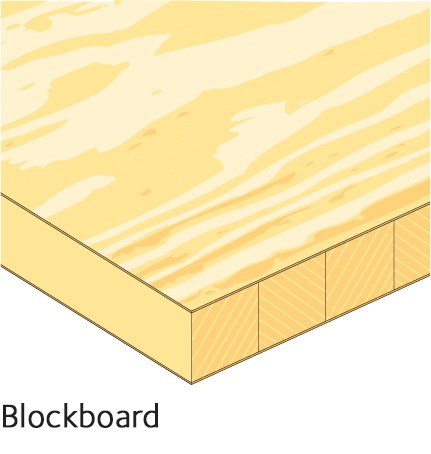 Blockboard is described according to the base material (pine staves for example) and the type of surface layer (veneer, fibreboard, melamine). An example is “laminboard” which is finished with a hardwood laminate.