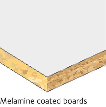 The melamine layer on faced particleboard is made by pressing together and heating several layers of paper impregnated with plastic. This melamine layer becomes a very thin facing material that not only provides a hardwearing surface but can also be used for decorative effect. Melamine on particleboard is the most common combination. Moisture-related movements can vary a little between the particleboard and a melamine layer, which is why it is best that both faces of the board are coated. If only one side is coated, the board may warp. Melamine faced board is widely used for furniture and interior fittings.
