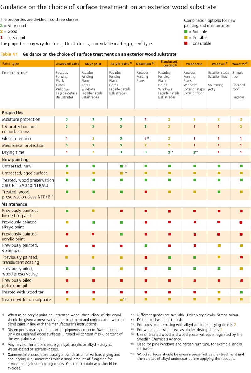 It is possible to buy factory-painted wood with an approved coating depth. It is not uncommon for suppliers’ transport protection against UV light (a thin film of paint) to be mistaken for a proper industrial surface treatment, which can lead to substandard painting results. Factory-painted external cladding that is not covered by performance requirements in a certified quality assurance system should have a film thickness, expressed as the amount of paint applied per square metre, averaging at least 60 μm (micrometres) as a dry layer.