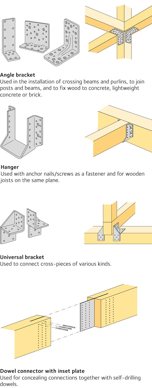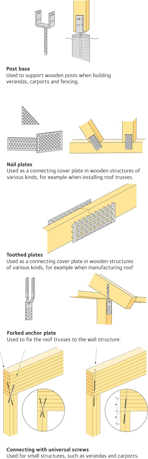 Structural fixings for making connections come in around 20 variants. They are generally sendzimir galvanised, hot-dip galvanised or stainless steel, and furnished with a large number of holes for nails or screws. The number of nails or screws required and the holes that should be used depend on which forces the fixing is transferring. Anchor nails and anchor screws are designed for maximum load uptake between fixing and underlying wood. This is determined in the design process or in simpler cases using the manufacturer’s information.
