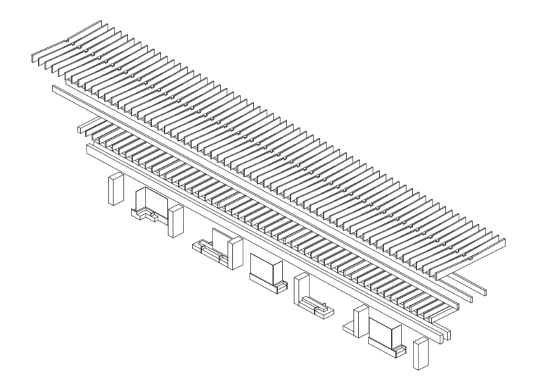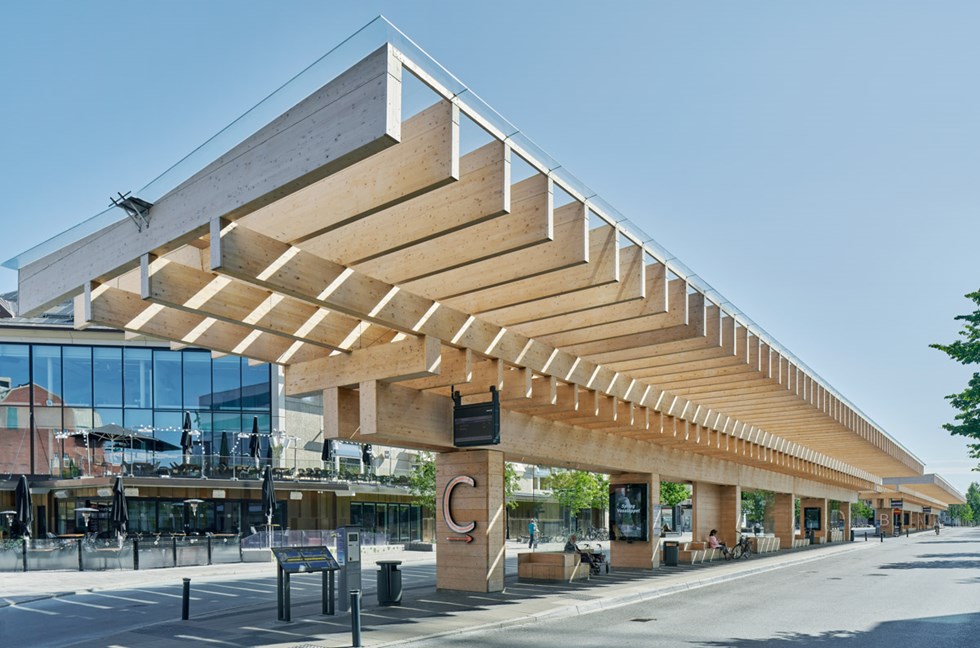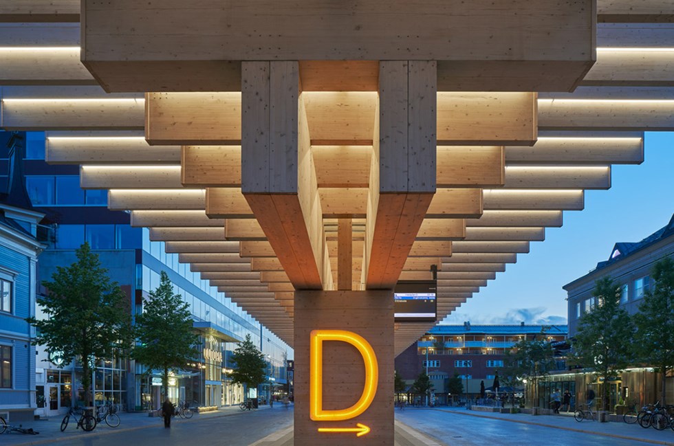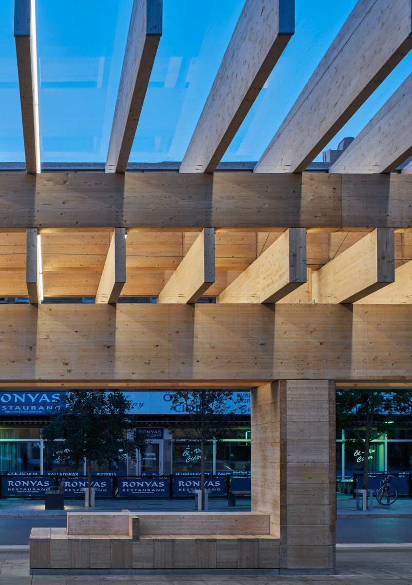 A word from the architect The building’s structure forms the backbone of its aesthetics. The transverse walls made of wood-panelled concrete bear four layers of beams on which the glass roof sits. The principle is timeless. The design is based on wood’s enduring ability to be used as both pillars and beams. The two roofs combined are 160 metres long and 10 metres wide. The load-bearing glulam beams come together to form a grid creating varying light play, as they provide no protection against rain and snow. The wood structure starts slightly above the base. The wood is untreated, which means that it will age in the same way as any other rain-protected timber in Västerbotten, that is, grey or darker depending on the situation.