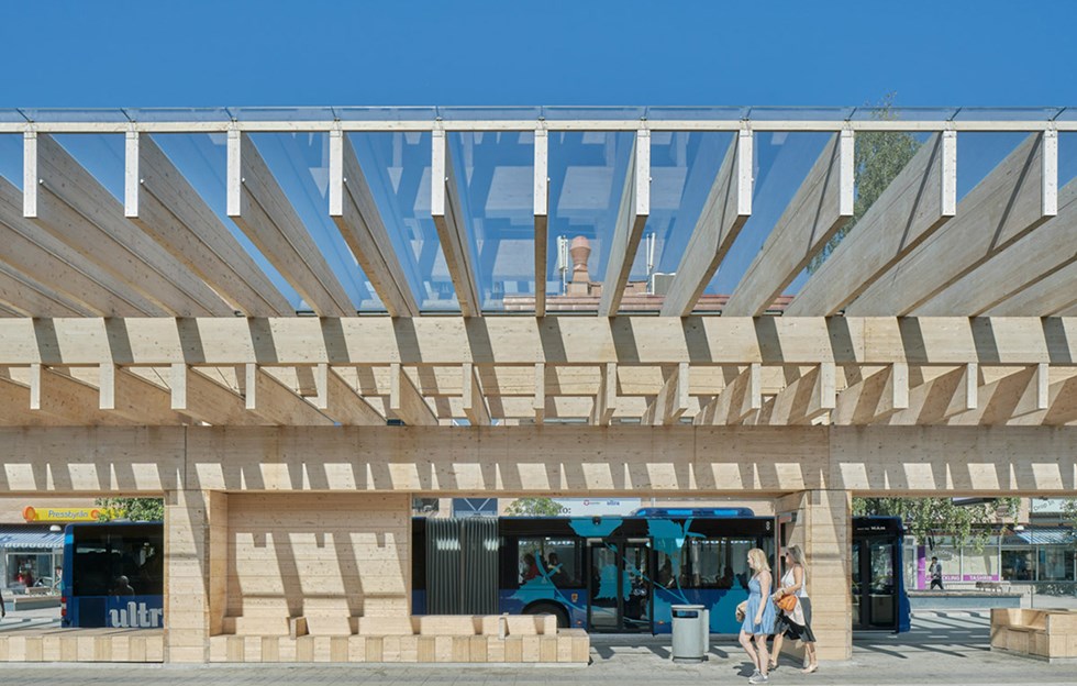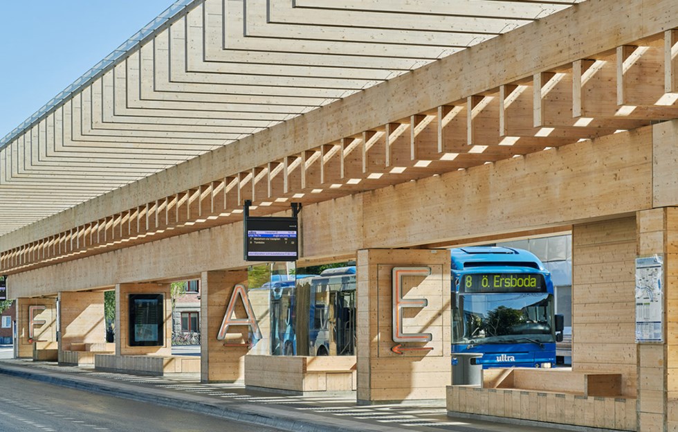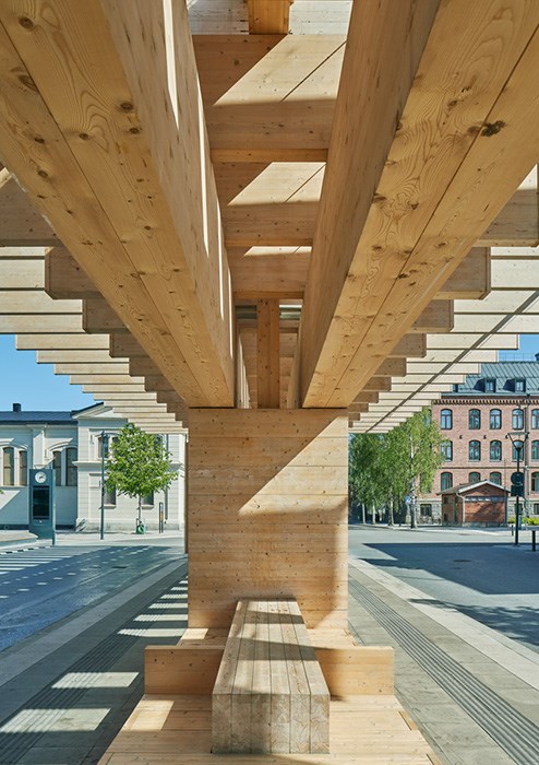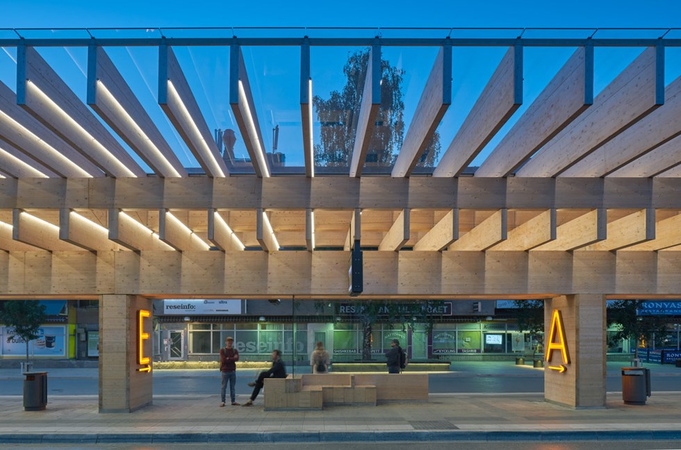 The sturdy glulam beams expand outwards and define the site through the repeated stacking of identical wooden elements. There is something mystical about its appearance – solid but with a balanced lightness of touch. Natural light filters through the wooden frame down to the core of the structure, where passengers can sit and wait in close contact with the wood. The place takes on an identity all of its own in the interplay between person and wood.