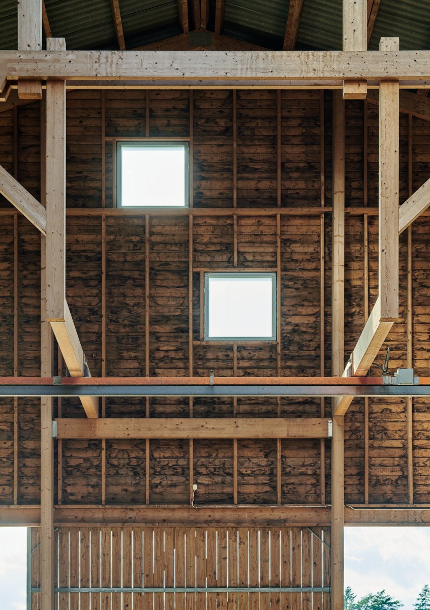 Natural light from overhead works with the large doors on the gable ends to give the cathedral-like volume an airy feel and highlight its structural elements. The use of robust materials breaks up the space and adds a level of detail that remains in keeping with the barn’s purpose.