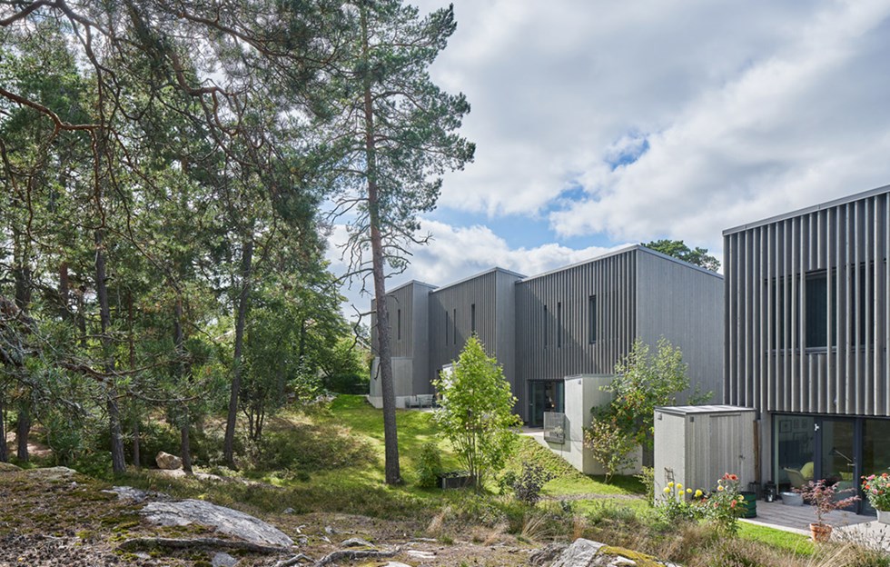 A word from the architect Wood has been the main theme throughout the process. The 12 terraced houses started out as an initiative by the architects, before the building contractor was selected. Initially, the project was named Furuhusen (or pine house). The houses form a bridge between nature and the city. The twelve terraced houses stand in two rows along a street in Bagarmossen. The rear of the houses looks over the Nacka nature reserve, with its hills and pine forest. The floor plan, spread over four half-floors, has been designed to harmonise with nature and topography. The timber, not least the grid façade, appear both open and closed, evocative of walking among the pines while at the same time reinforcing the connection to the street as a social meeting place.