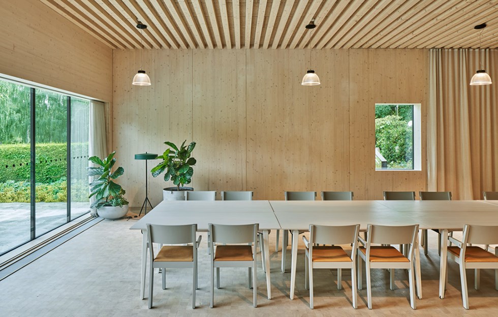 The interior is organised to perfectly fulfil the building’s intentions and requirements. Robust workshop space combines with offices, an intimate garden room and a place of worship, weaving the profane and the spiritual together. The feel and beauty of wood envelops us in the ceilings, walls and floors.