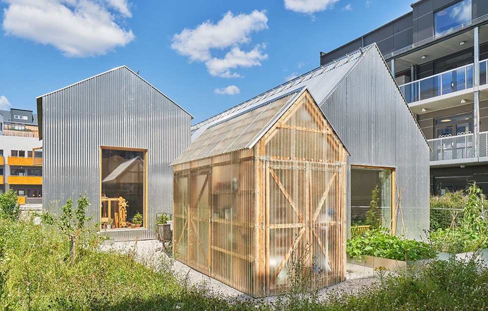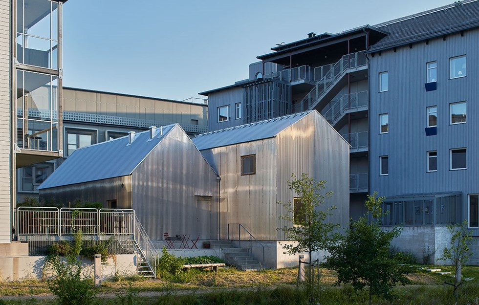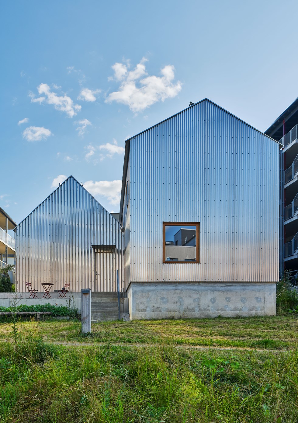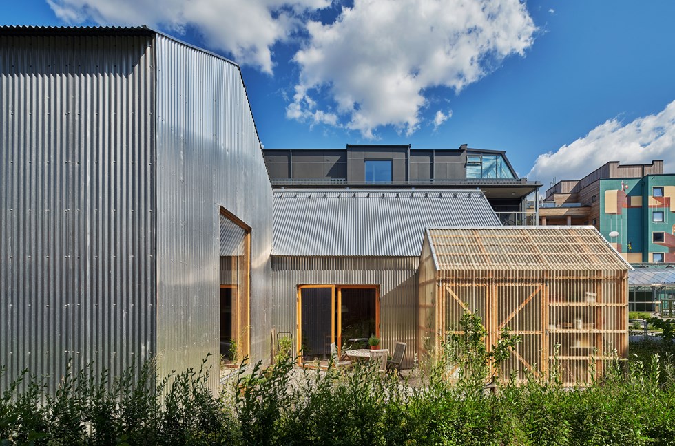 The building works in harmony with the plot, using cleverly placed openings to invite in the surrounding garden and the neighbouring homes. The aluminium cladding envelops and protects the interior, while at the same time issuing a challenge to the wider built environment. The project displays an exchange between interior and exterior space, between different scales and materials.